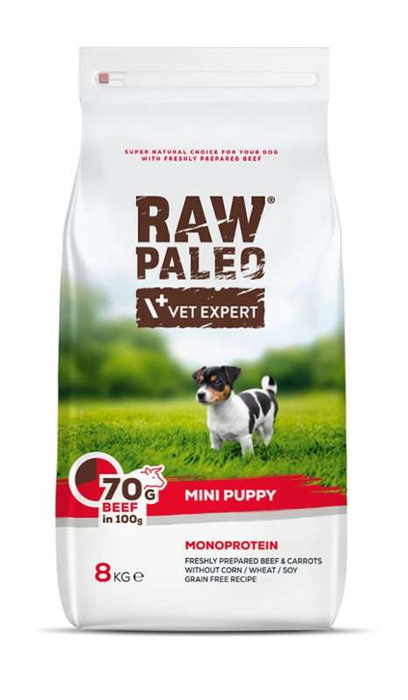 RAW PALEO MINI PUPPY z wołowiną jest kompletną i zbilansowaną karmą dla psów rosnących ras małych (których masa ciała osobników dorosłych nie przekracza 8 kg), w okresie od odsadzenia do 12 miesiąca życia. Receptura karmy jest bezzbożowa i monobiałkowa, co oznacza, że jedynym źródłem białka pochodzenia zwierzęcego jest wołowina. Dodanie oleju z wyciągu z wodorostów wspiera rozwój mózgu oraz narządu wzroku u szczeniaka. Wprowadzenie do receptury karmy Fruktooligosacharydów i Mannanoligosacharydów wspomaga pracę przewodu pokarmowego oraz wspiera stabilizację mikroflory jelit.
